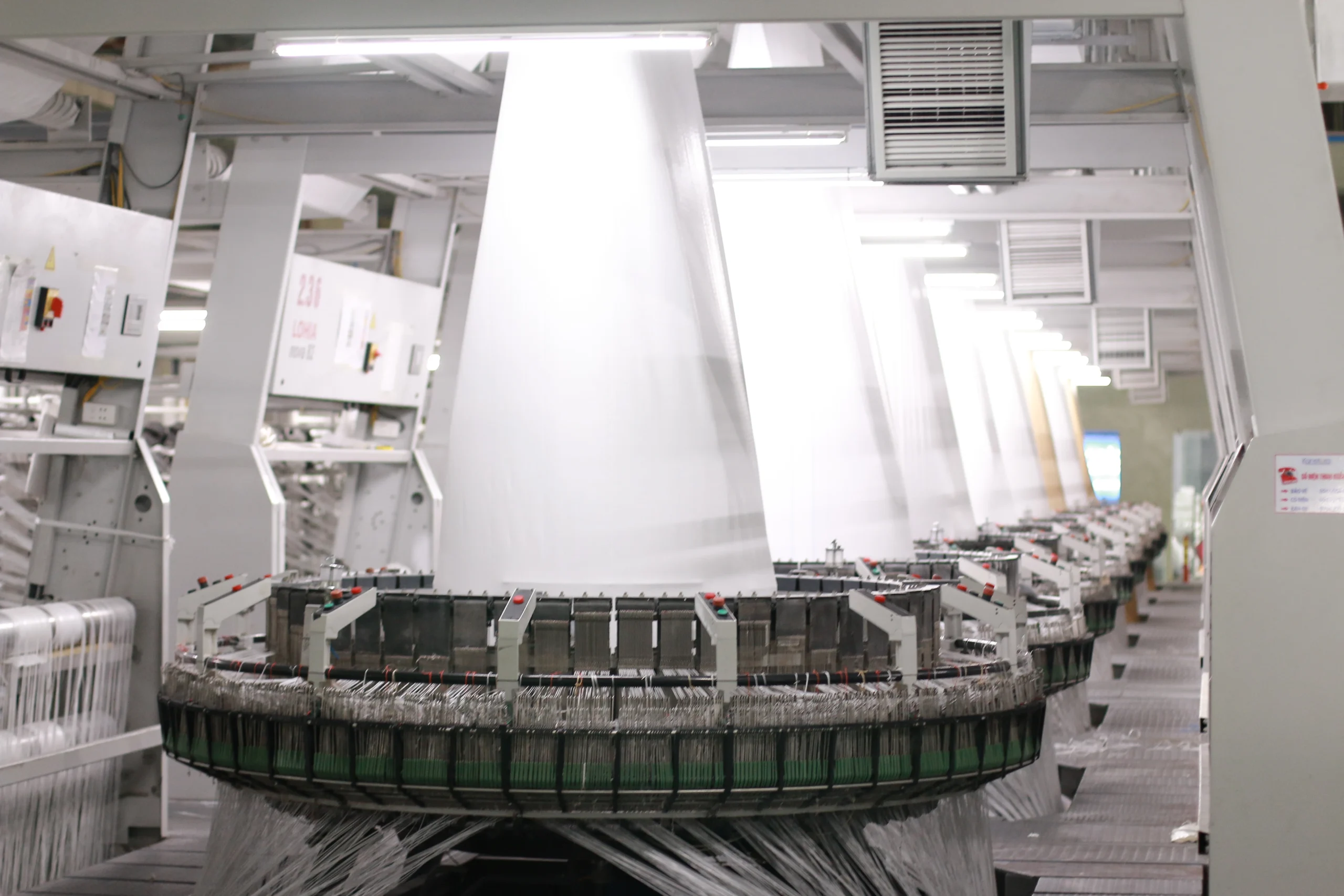 Integrated production lines: Extrusion, weaving, coating, cutting, printing, and sewing