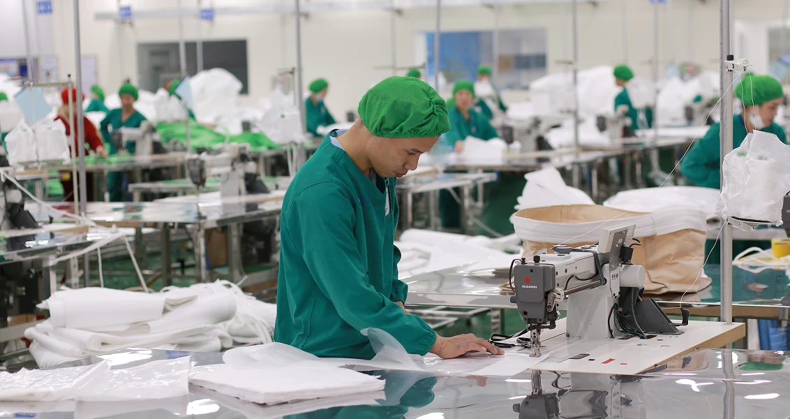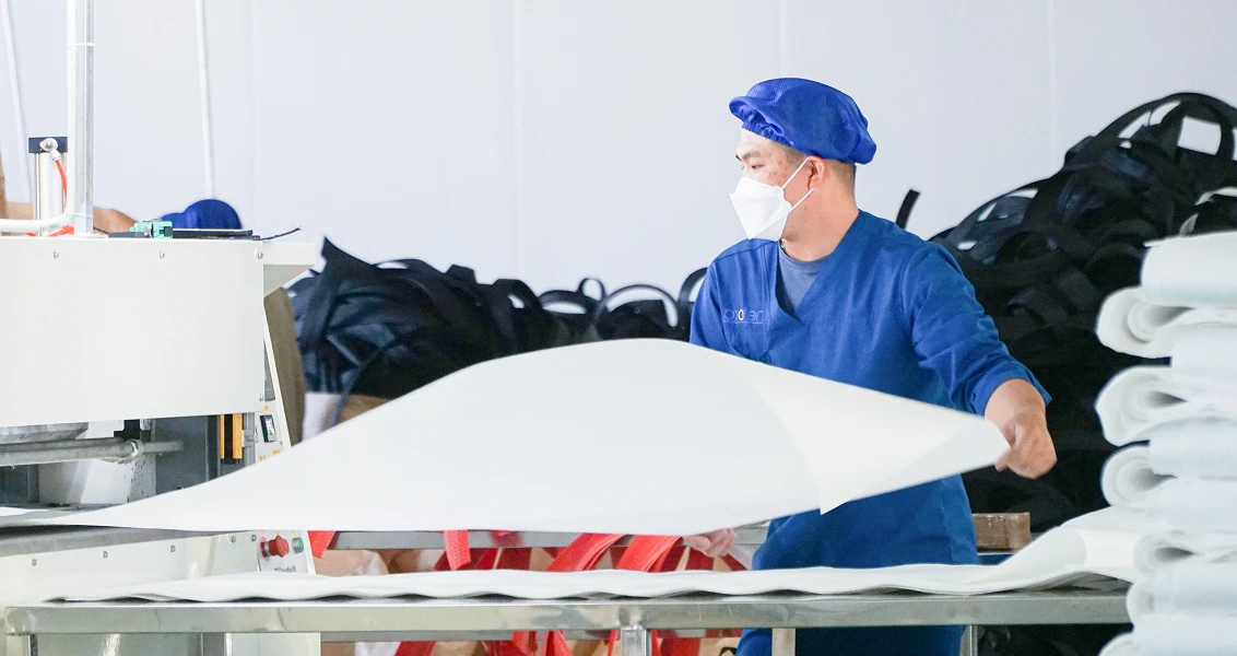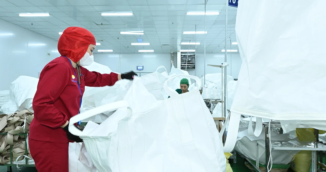 Skilled operators assemble body, loops, liners, and accessories to form complete FIBC bags.