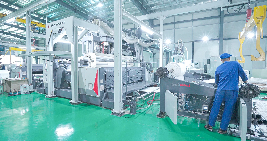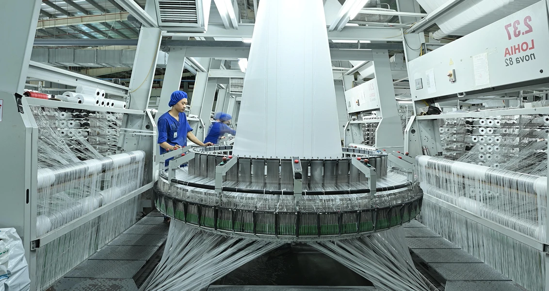 Woven tapes are converted into durable PP fabric using high-speed circular and flat looms.